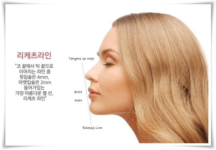 - 턱의 후퇴 여부를 판단하는 가장 손쉬운 방법은 측면에서 코끝과 턱끝의 가장 튀어나온 부분 pogonion을 연결한 리켓츠라인으로 이 선이 아랫입술의 홍순 경계에 닿는 것을 보는 것이며 동양인에서 이상적인 턱끝은 코끝과 입술을 연결한 선과 일직선 상에 놓이는 것이다.